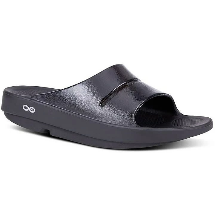 The Oofos OOahh Luxe Slide features revolutionary OOfoamâ„¢ technology that absorbs 37% more impact than traditional footwear foam materials to reduce the stress on your feet and joints. This technology aids in the recovery process and creates an incredibly comfortable sandal you can wear anywhere. Oofos Luxe treatment features hand-painted details that are unique to this OOahh style.